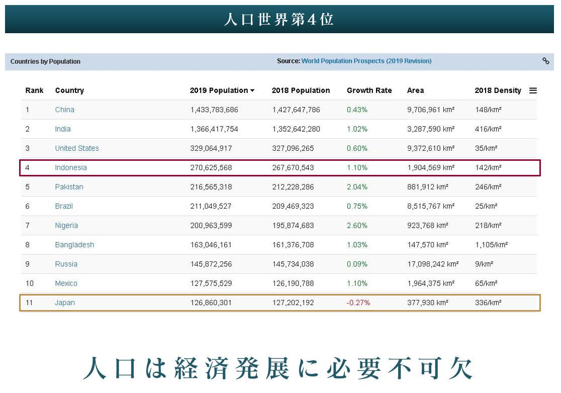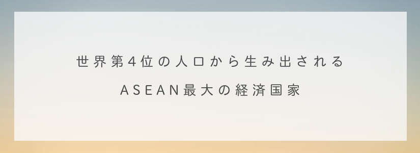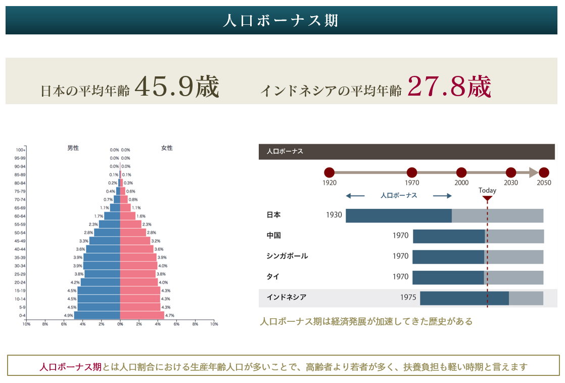 インドネシアの経済的なポテンシャルは東南アジアNo.1です。まず一番に挙げられるのは人口です。世界第4位の人口で2.6億人以上の方が暮らしています。さらに平均寿命は27.8歳と若い労働力がこれから爆発する人口ボーナス期を迎えます。2020年から始まり2030年が人口ボーナスのピークとなっているので、これから更なる成長が見込めます。