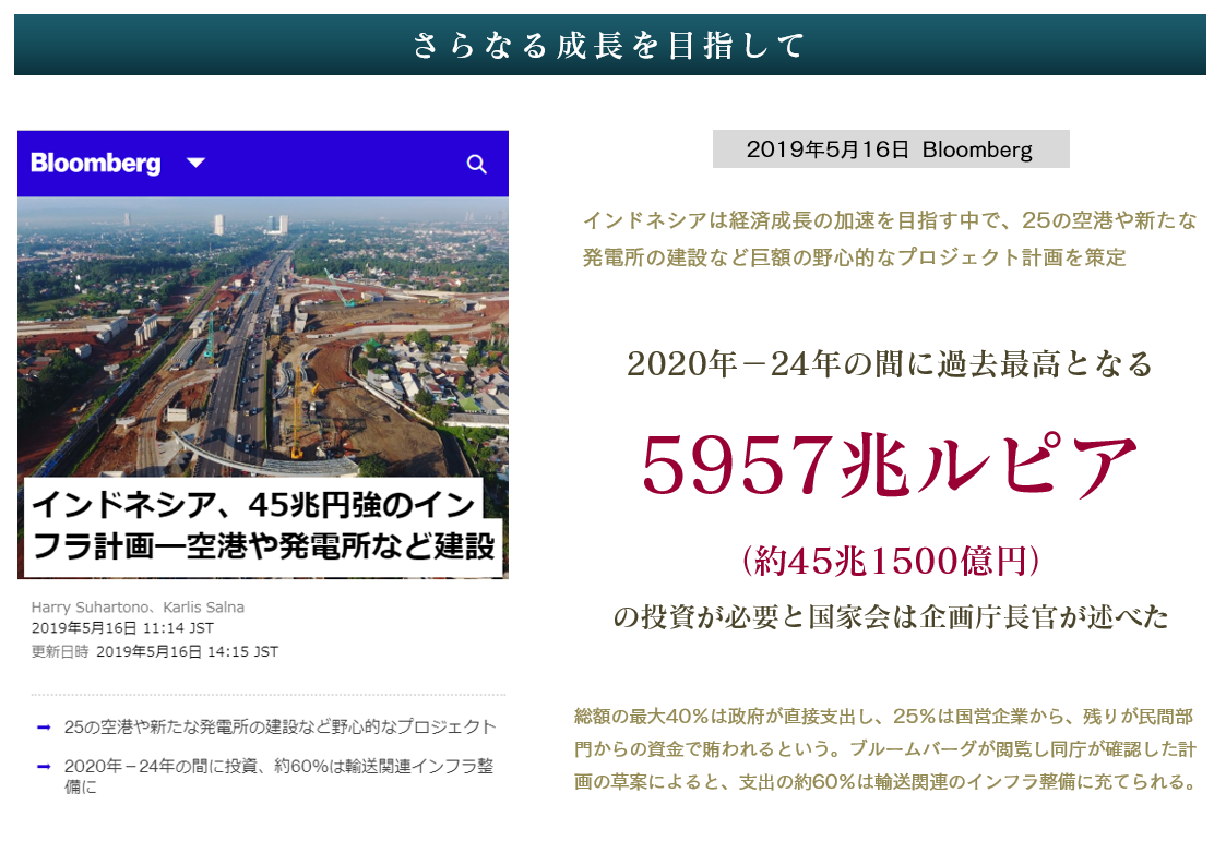 大統領が2019年に再選したことで、今後は更なるインフラ投資目標を掲げています。その金額は日本円で42兆円という巨額の投資を国と民間企業、海外資本でまかなわれます。大きな目標はやがて東南アジアNo.1、そして世界でも有数な経済大国への発展の足がかりとなります。
