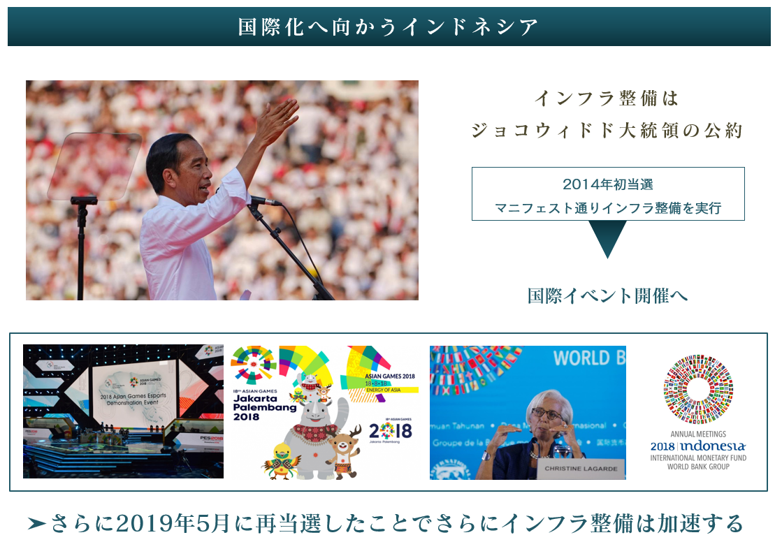 2014年に大統領に就任したジョコウィドド大統領によって一気にインフラ投資が加速しました。インフラ投資では水道・ガス・電気に加えて道路・空港・港・鉄道などの交通インフラが整えられ、結果的に物流の強化されて物の流通が盛んになりました。インフラ投資によってもたらされた効果は国際的なイベントの開催も行えるようになりました。近年ではアジア大会やG20など大きなイベントが開催されています。